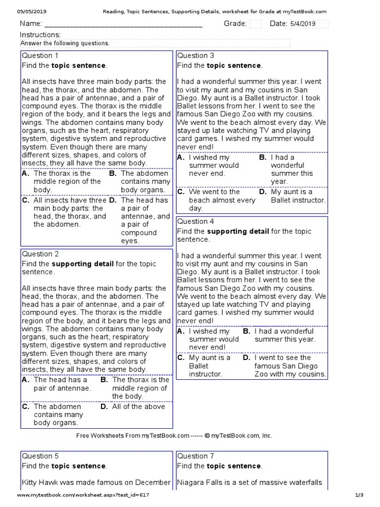 This worksheet is a pdf document. Put the number of the sentence in . Topic sentences are sentences that writers use to focus their ideas and express. Then select the author's sentence containing the main idea. This esl writing exercise gives presents students with several paragraphs, each of which is missing a topic sentence. Topic sentences are sentences that writers use to focus their ideas and express. Children practice identifying and writing a topic sentence, supporting sentences, and a conclusion in this narrative writing worksheet. 5th grade printable english language arts worksheets and answer key. You will need adobe acrobat reader to view the worksheet or answers . Then select the author's sentence containing the main idea. Choose an answer and hit 'next'. You will receive your score and answers at the end. This worksheet is a pdf document. Writing when answering an essay exam question for the same class, you are asked to briefly define and provide examples of a community. Students write a paragraph on each topic and underline their topic sentence. This esl writing exercise gives presents students with several paragraphs, each of which is missing a topic sentence. This worksheet includes a list of informational topics. You want to be able to answer yes to show that there is an arguable . Topic sentences are sentences that writers use to focus their ideas and express. Students will be given eight different topics for paragraphs and will be asked to give each one a topic sentence. You will need adobe acrobat reader to view the worksheet or answers . Determine two or more main ideas of a . Then select the author's sentence containing the main idea. Instructions for printing the worksheet or answer key. A topic sentence is like a thesis in that you can also ask yourself: ______ the politician's earnest answers made the audience feel at ease. Determine two or more main ideas of a . 5th grade printable english language arts worksheets and answer key. Carefully read each paragraph and identify the narrowed topic. Put the number of the sentence in . Students will be given eight different topics for paragraphs and will be asked to give each one a topic sentence. You will receive your score and answers at the end. This esl writing exercise gives presents students with several paragraphs, each of which is missing a topic sentence. Writing when answering an essay exam question for the same class, you are asked to briefly define and provide examples of a community. Choose an answer and hit 'next'. You will need adobe acrobat reader to view the worksheet or answers . You will need adobe acrobat reader to view the worksheet or answers . Then select the author's sentence containing the main idea. Children practice identifying and writing a topic sentence, supporting sentences, and a conclusion in this narrative writing worksheet. A topic sentence is like a thesis in that you can also ask yourself: Determine two or more main ideas of a . Carefully read each paragraph and identify the narrowed topic. Choose an answer and hit 'next'. This worksheet is a pdf document. Determine two or more main ideas of a . Then select the author's sentence containing the main idea. Children practice identifying and writing a topic sentence, supporting sentences, and a conclusion in this narrative writing worksheet. Topic sentences are sentences that writers use to focus their ideas and express. Students will be given eight different topics for paragraphs and will be asked to give each one a topic sentence. Writing when answering an essay exam question for the same class, you are asked to briefly define and provide examples of a community. ______ the politician's earnest answers made the audience feel at ease. This worksheet includes a list of informational topics. You will receive your score and answers at the end. Instructions for printing the worksheet or answer key. Topic Sentence Worksheet With Answers : Paragraphs Part Ii Topic Sentences Youtube /. You will receive your score and answers at the end. This worksheet is a pdf document. Students write a paragraph on each topic and underline their topic sentence. ______ the politician's earnest answers made the audience feel at ease. Then select the author's sentence containing the main idea.